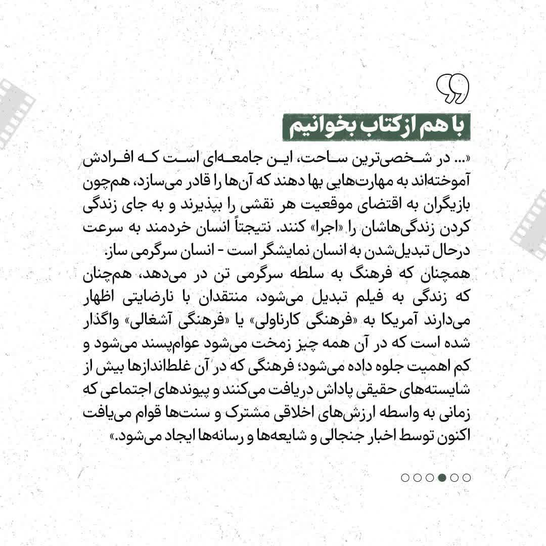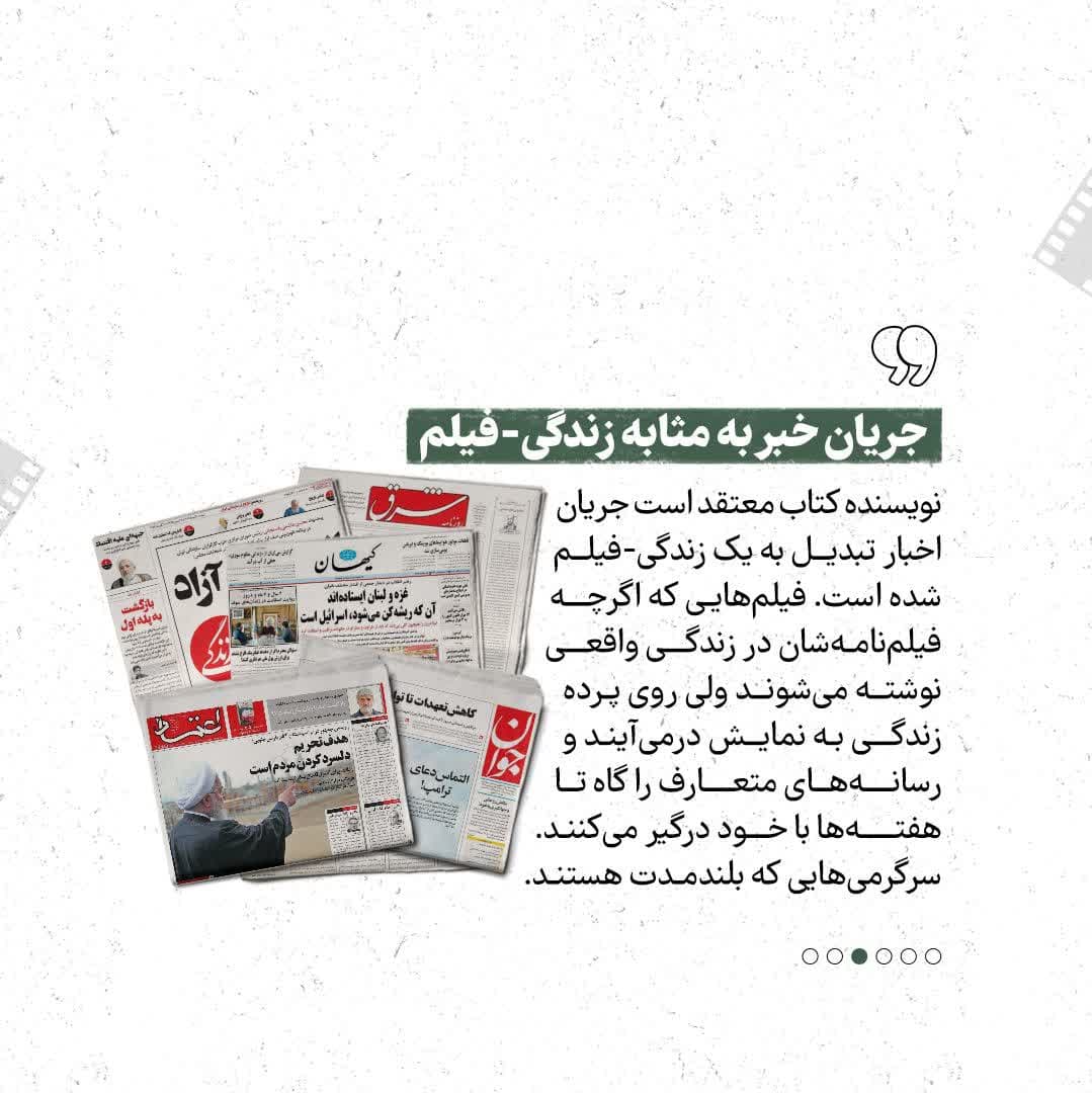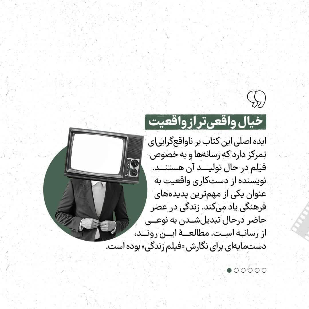 تغییرات سبک زندگی تأثیرات فراوانی بر همه جوامع داشته اند ،نقد این اتفاق خود مسیری را برای بهینه سازی روندها به سوی آینده می گشاید.ایده اصلی این کتاب بر ناواقع گرایی ای تمرکز دارد که رسانه‌ها و به خصوص فیلم در حال تولید آن هستند. نویسنده از دست کاری واقعیت به عنوان یکی از مهم‌ترین پدیده‌های فرهنگی یاد می‌کند. زندگی در عصر حاضر در حال تبدیل شدن به نوعی از رسانه است. مطالعه این روند دستمایه‌ای برای نگارش «فیلم زندگی» بوده است.